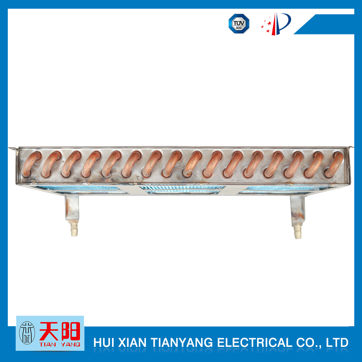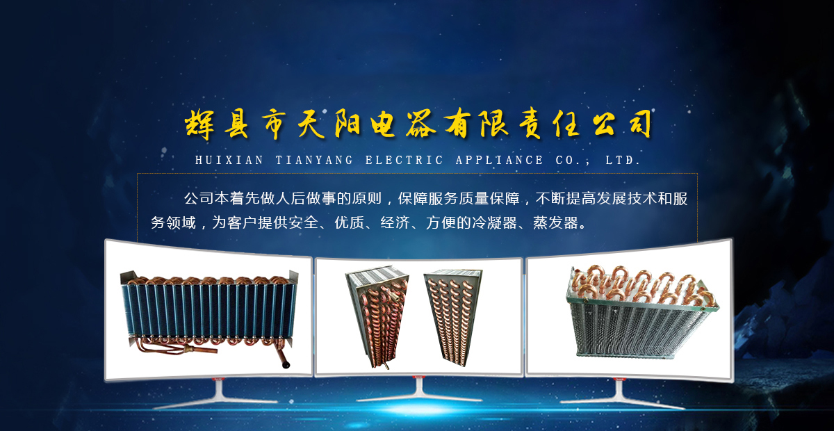 輝縣天陽電器有限責(zé)任公司位于肥沃的中原河南省輝縣市學(xué)院路中段工業(yè)集聚區(qū)興業(yè)園3號廠房,以制冷設(shè)備用冷凝器,蒸發(fā)器,熱交換器為主。主要材料為銅管鋁翅片,銅管銅翅片,鋁管鋁翅片。廣泛應(yīng)用于冰箱冰柜,制冷設(shè)備,暖通設(shè)備,空調(diào),自動售貨機(jī),冷干機(jī),超市立風(fēng)柜,冷藏車,烘干機(jī)等產(chǎn)品領(lǐng)域。  公司自1998年成立以來,始終堅持:“科技造就產(chǎn)業(yè)、質(zhì)量成就信譽(yù)、誠信鑄就輝煌”的質(zhì)量方針,從產(chǎn)品拓展上堅持“人無我有,人有我優(yōu),人優(yōu)我特的”經(jīng)營理念,25年來,從1998年開始供應(yīng)河南冰熊集團(tuán)下屬的冷柜廠,制冰機(jī)廠各種冷凝器;2003年之后,原冰熊集團(tuán)的精英志士開始在全國各地發(fā)展,所到之處依托我公司供貨,以致于多家目前已具行業(yè)中佼佼者的公司,從而建立了如凱雪公司,兆邦公司、凌云公司、海寶公司、正雪公司、上海忠云、山東德萊維等幾十余家公司在草創(chuàng)時期的啟蒙供貨商,友好共贏長達(dá)十余年,成為我國制冷行業(yè)的供應(yīng)商。以致在2015年初雙匯集團(tuán)面向社會的招標(biāo)書中指名要我公司冷凝器、蒸發(fā)器指定產(chǎn)品供應(yīng)商